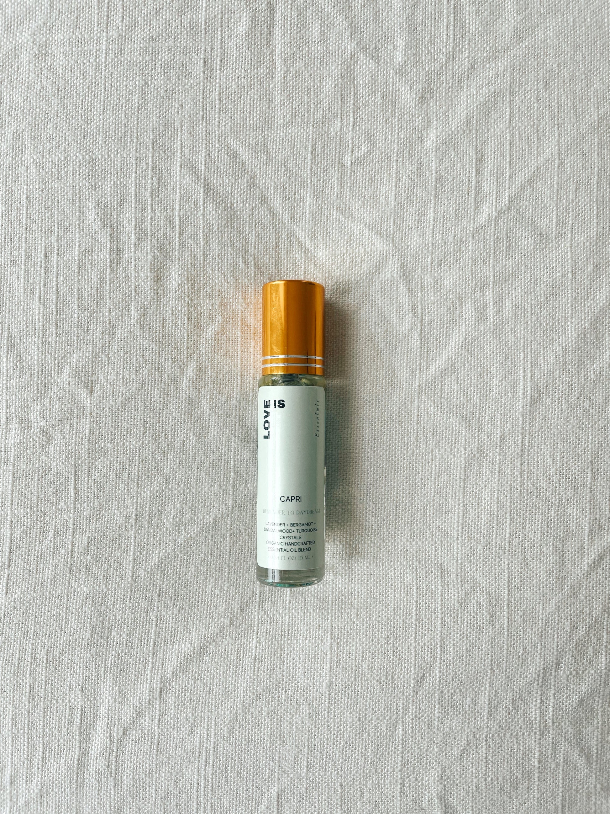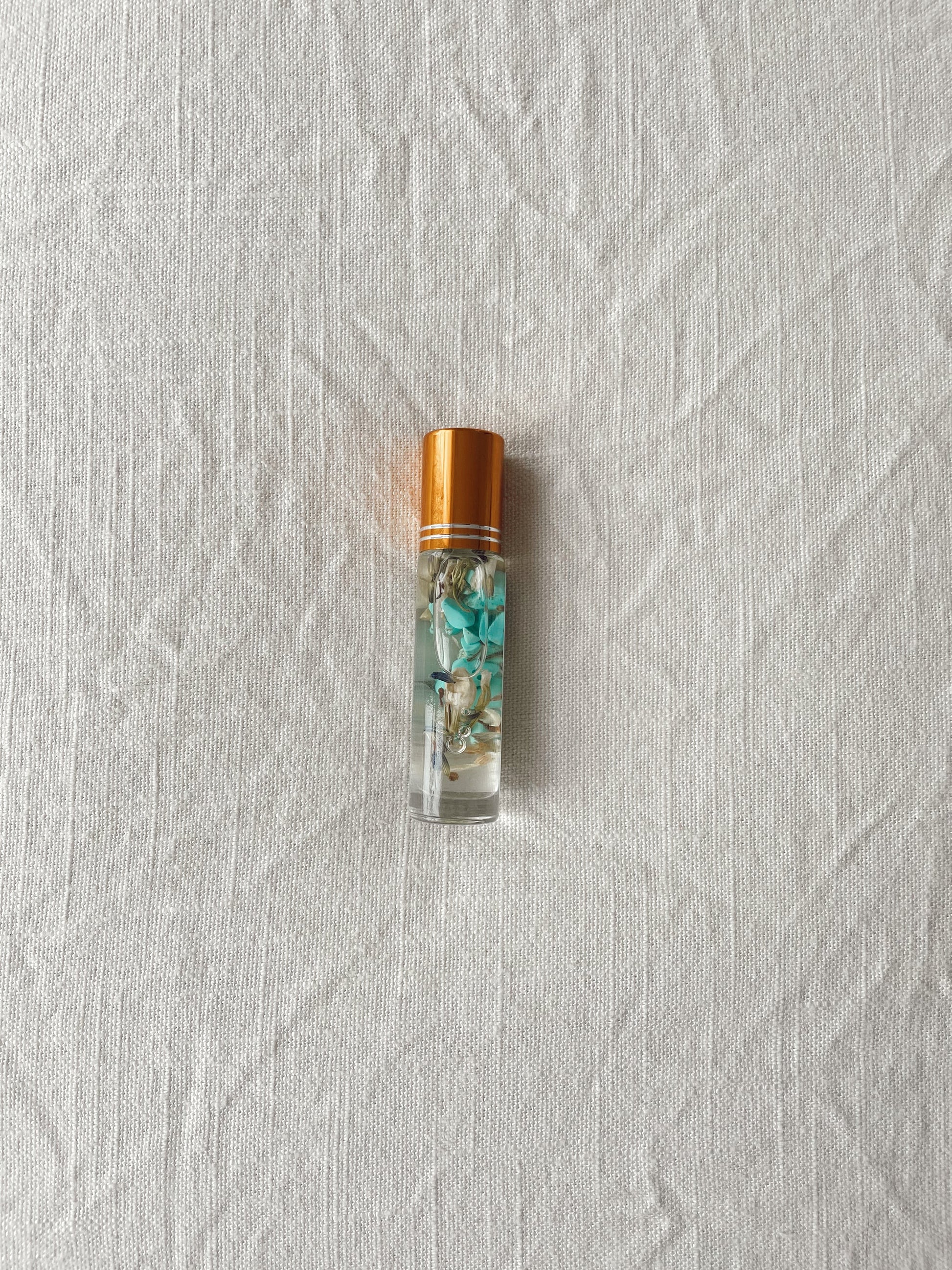 Aromatherapy is scientifically proven to enhance the mood and outlook of the user. Allow for the healing scent of lavender, the calming scent of sandalwood, and the uplifting qualities of bergamot to energize and center you. Turquoise crystals, which are commonly used to open the throat chakra, are placed in the roller bottle to help enhance communication and self expression. A fragrant medley of dried flowers are blended into the oil, adding to the Earthy and holistic feel, and creating a healing and calming sensation. Due to its size and sweet scent, this roll on is perfect to keep on hand to refresh your fragrance throughout the day.