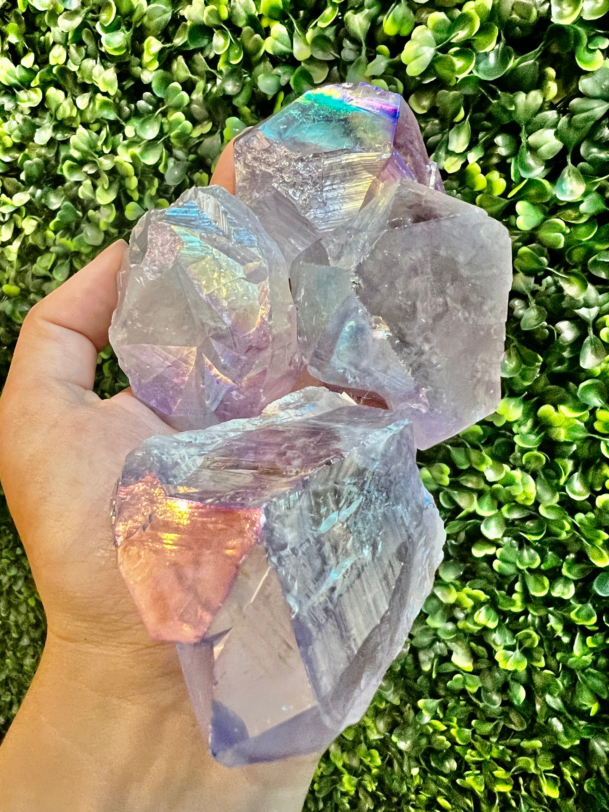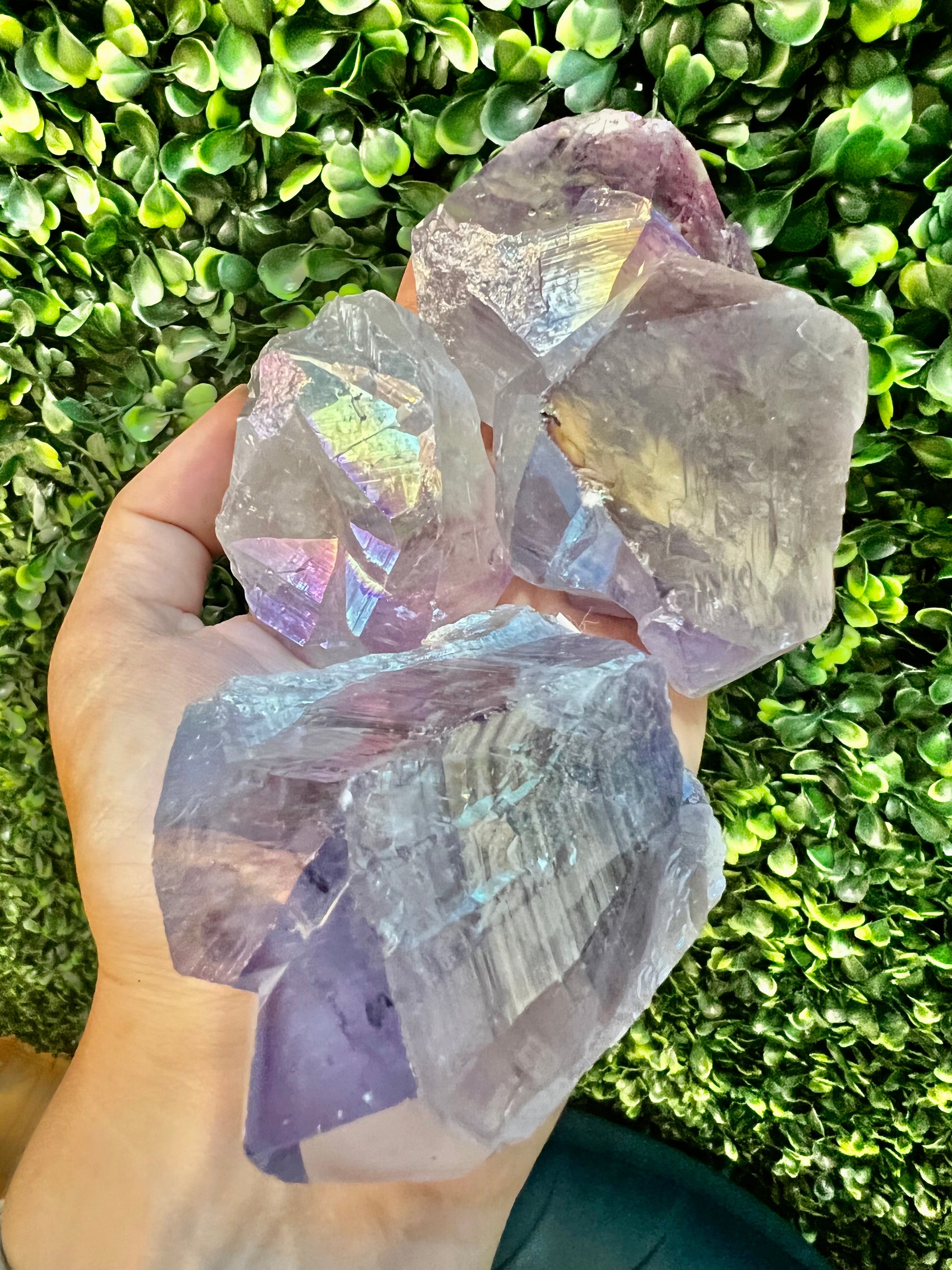 Angel Aura Amethyst radiates high vibrations that send positivity, light, peaceful thoughts, loving energy, optimism, and joy into your life