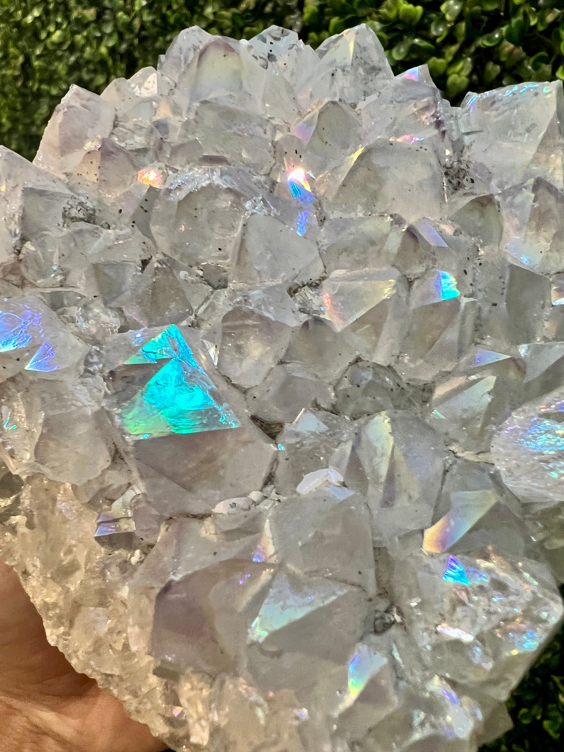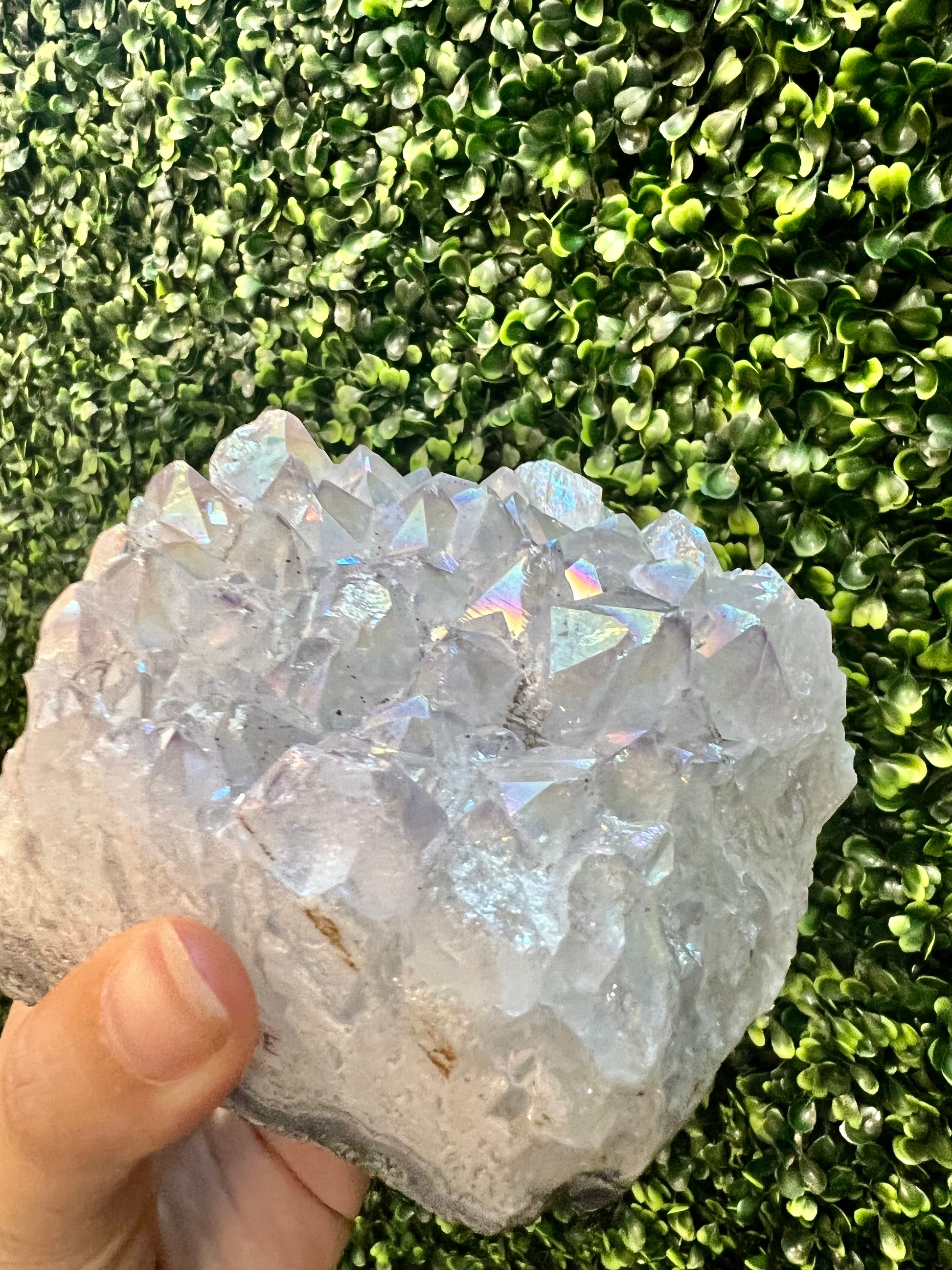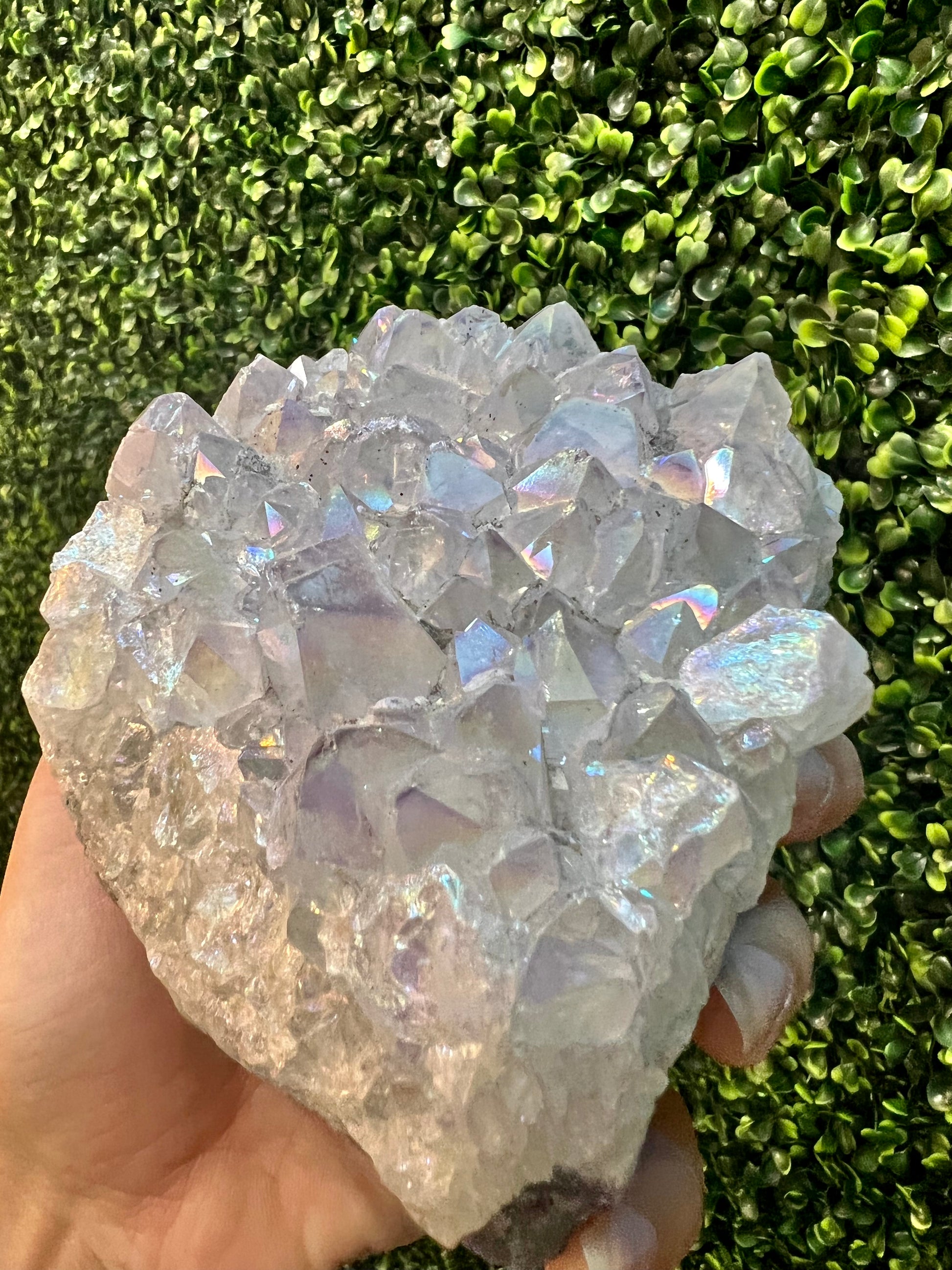 Angel Aura Quartz radiates high vibrations that send positivity and light. The meaning behind this ethereal stone is purity, joy, peace, and clarity. It helps to soothe emotional or spiritual distress, angel aura quartz can support you by lifting your vibration and sending you peace of mind. It can also help you to think more clearly and can unlock the potential for love to guide your decisions.