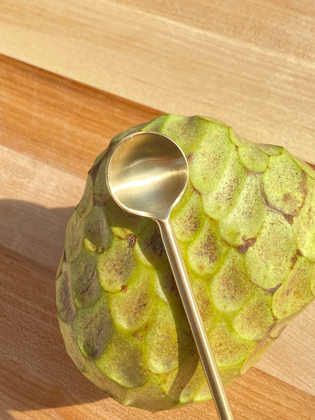 Our little brass spoon is handmade in India exclusively for Moodbeli. It's the perfect size for adding one serving of our blends to your favorite tonics, lattes, teas, and smoothies.