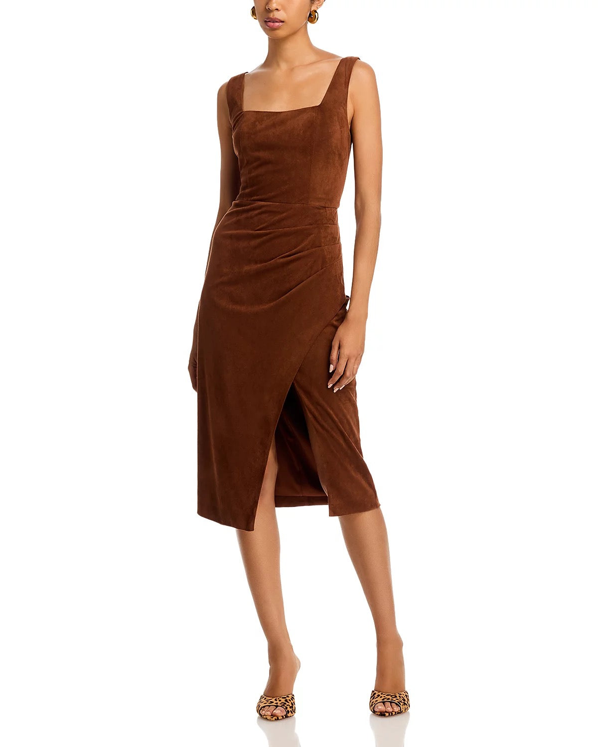 Faux suede fabric, pleated gather at one hip, slit at side skirt