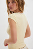 Features: Micro-ribbed cotton blend, square neckline, lace trim at neck, capped short sleeves, lettuce-edge hem