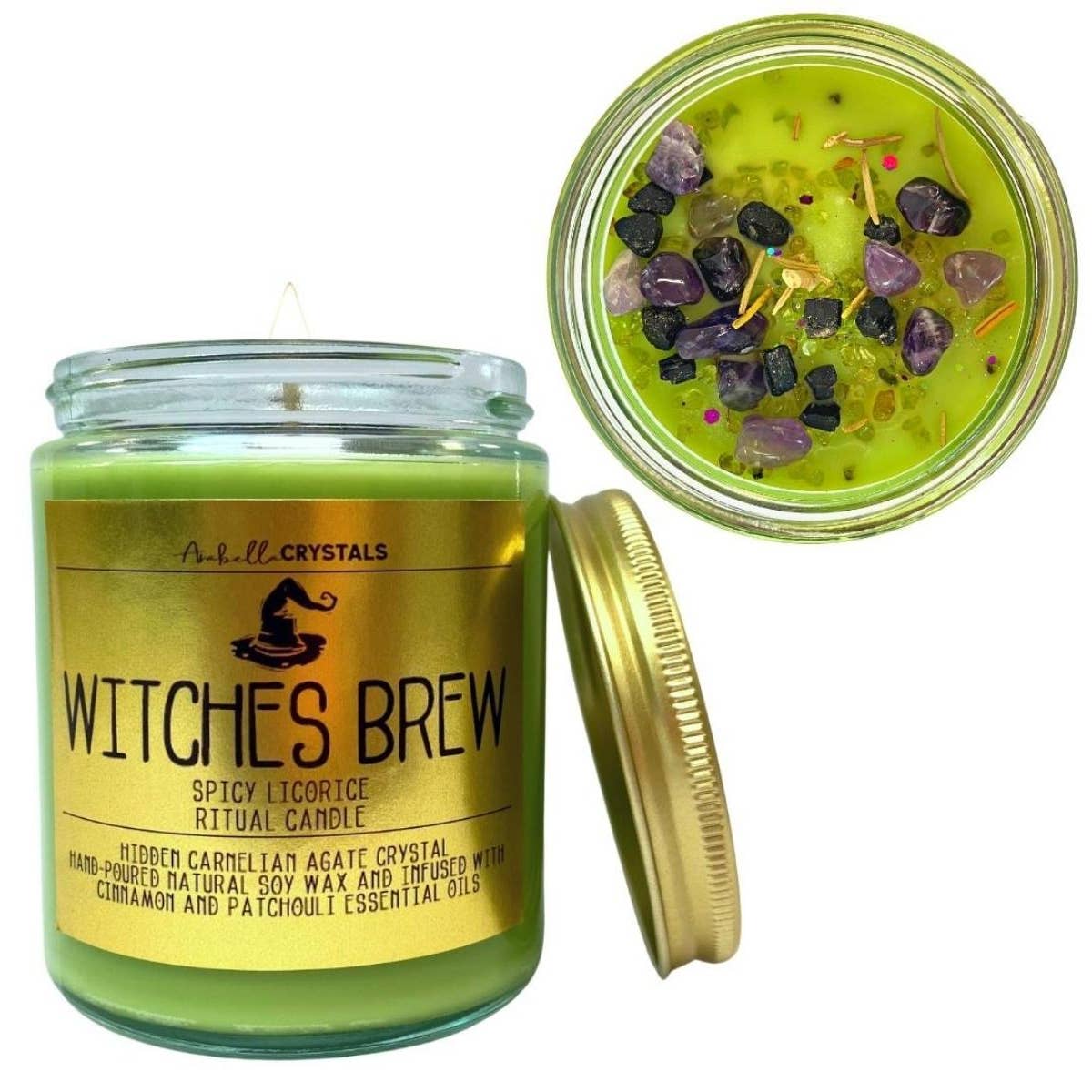 WITCHES BREW Coming back after last Halloween, WITCHES BREW is here to stay. To be a Witch is to be a healer, a teacher, a seeker, a giver and a protector of all things. IF this path is yours, may you walk it with honor, light and integrity. ____________________________________________ SCENT: Spicy Licorice + Patchouli and Cinnamon essential oils HERBS/WOODS: ROSEMARY - Solar Energy GEMSTONES / MINERALS: HIDDEN CARNELIAN AGATE - Vitality AMETHYST - Connection to Spirit TOURMALINE - Protecting PERIDOT - Prosperity and Growth